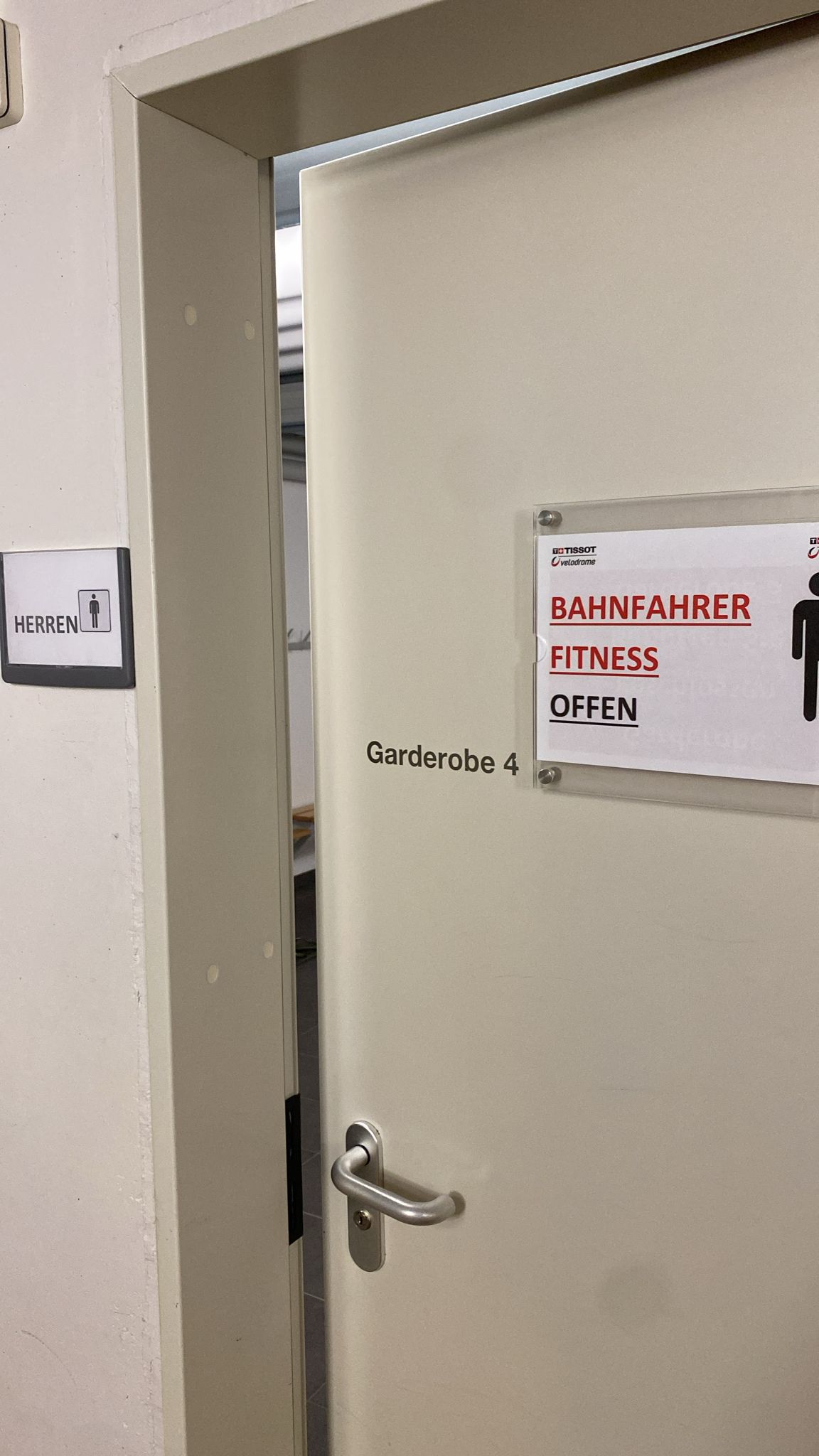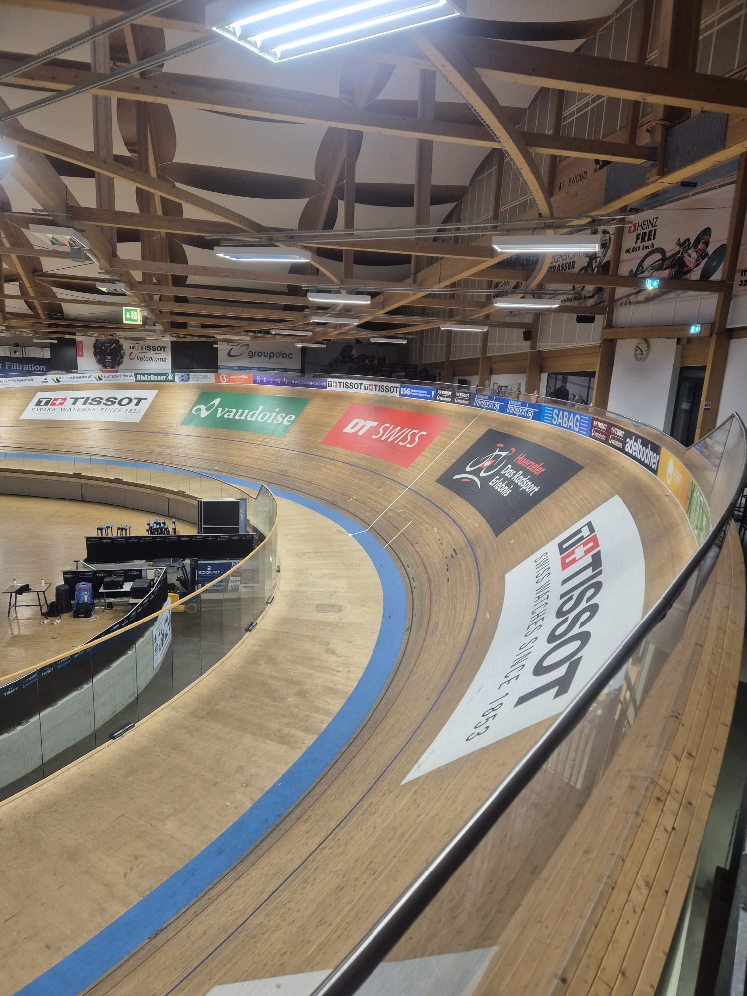 Die Teilnehmenden mussten zuerst den Haftungsausschluss für das riskante Unterfangen unterschreiben. Anschliessend zogen sie sich die engsten Kleider über, damit der Strömungswiderstand verkleinert werden konnte. Bruno, Gerry und Yves, die erfahrenen Instruktoren, übergaben allen ein passendes Bahnfahrrad und führten ein professionelles, kurzes Bikefitting durch. Danach betraten alle zusammen ehrfürchtig die Halle. Zu sehen gab es eine 250m lange, 7m breite und bis 46° steile Bahn aus sibirischem Holz. Erste Pulsrekorde wurden nur schon durch den Anblick gebrochen.